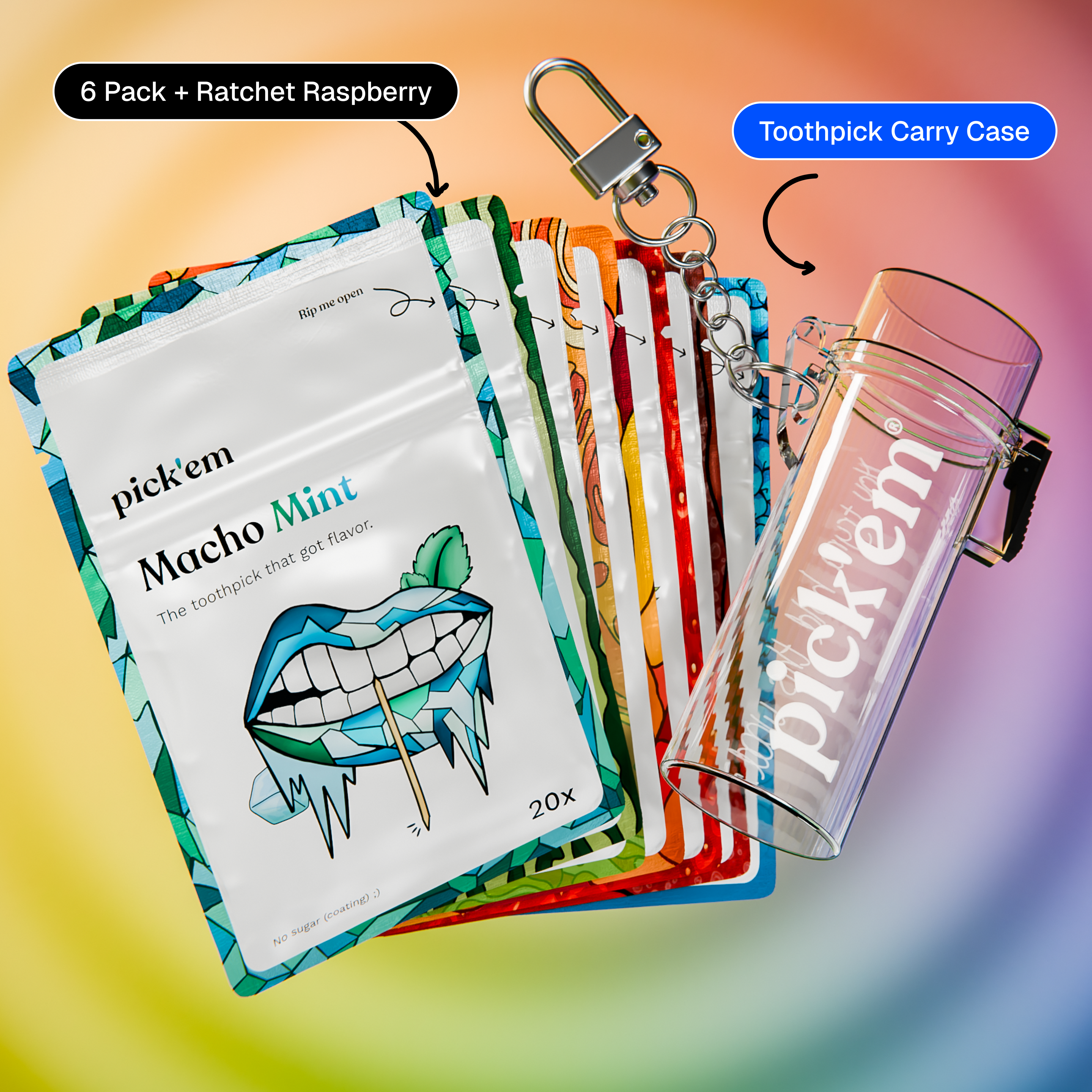 Strawberry, Peach, Cola, Mango, Mint, Watermelon, Blue raspberry flavored toothpicks + Toothpick Carry Case